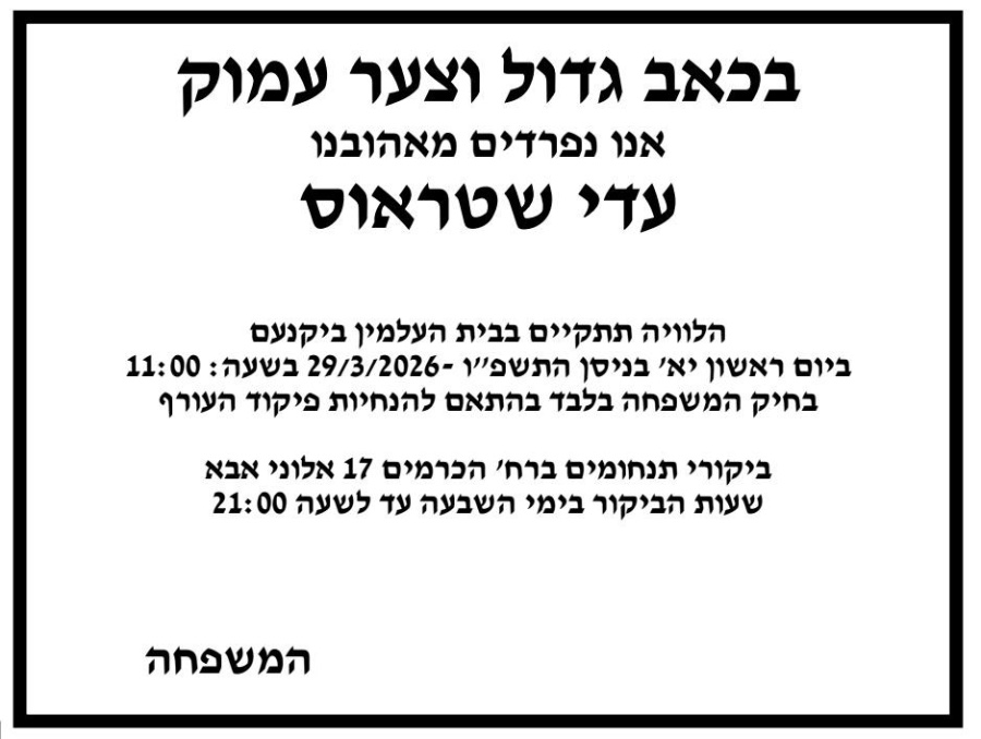 משתתפים בצערם העמוק של משפחת שטראוס עם פטירתו של עדי, בנם של יעל ומיכה, לאחר מאבק במחלה קשה.